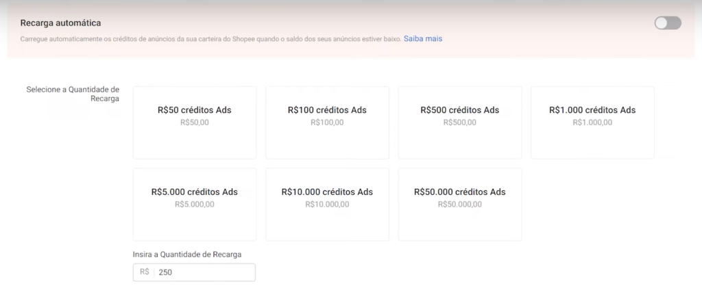 Exemplo prático: Se você vai anunciar 2 produtos, com R$ 10,00 por dia durante 15 dias, você precisa de uma recarga inicial de R$ 300,00. Trate esse valor como o custo de aquisição de inteligência para o seu negócio.