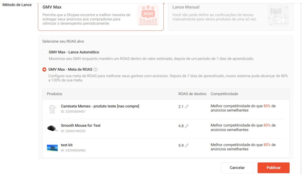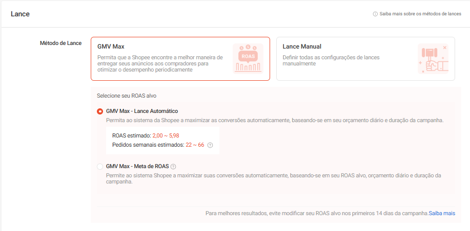 Nesse modelo, o algoritmo da Shopee trabalhará para entregar o seu anúncio para compradores com maior probabilidade de conversão, buscando atingir a meta de Retorno Sobre o Investimento em Publicidade (ROAS) que você definiu.